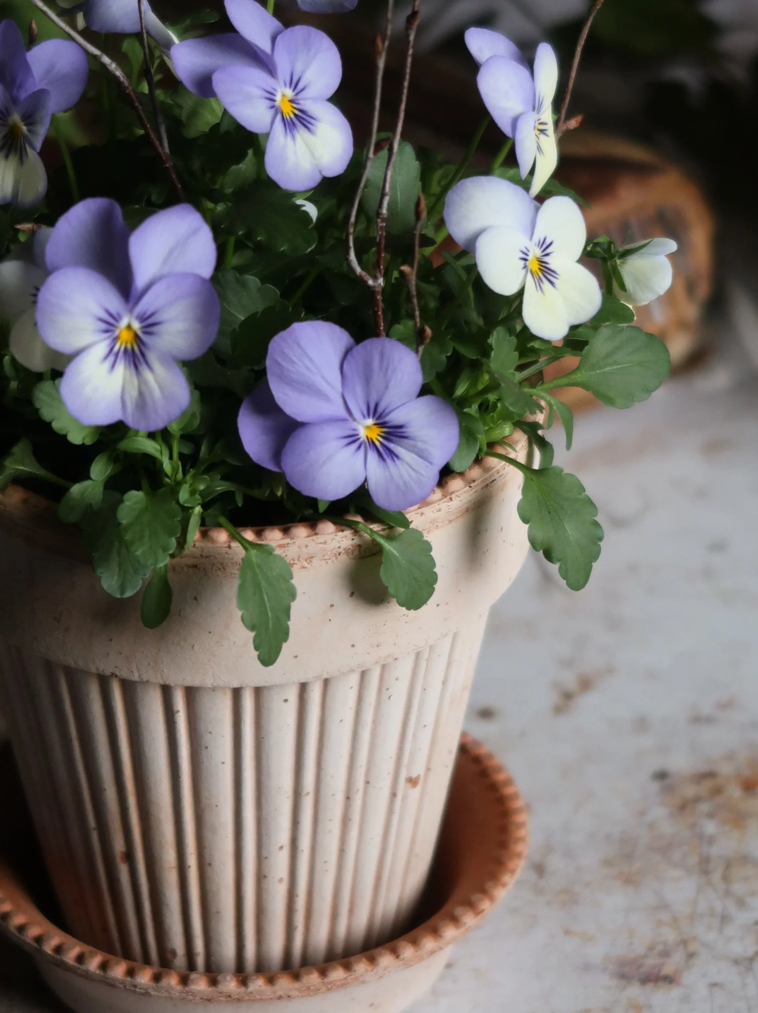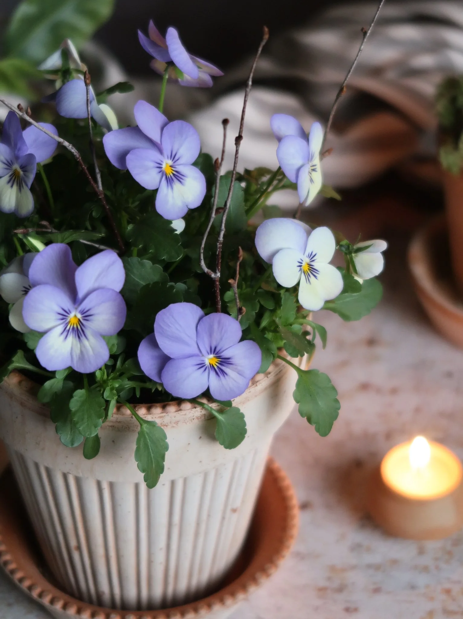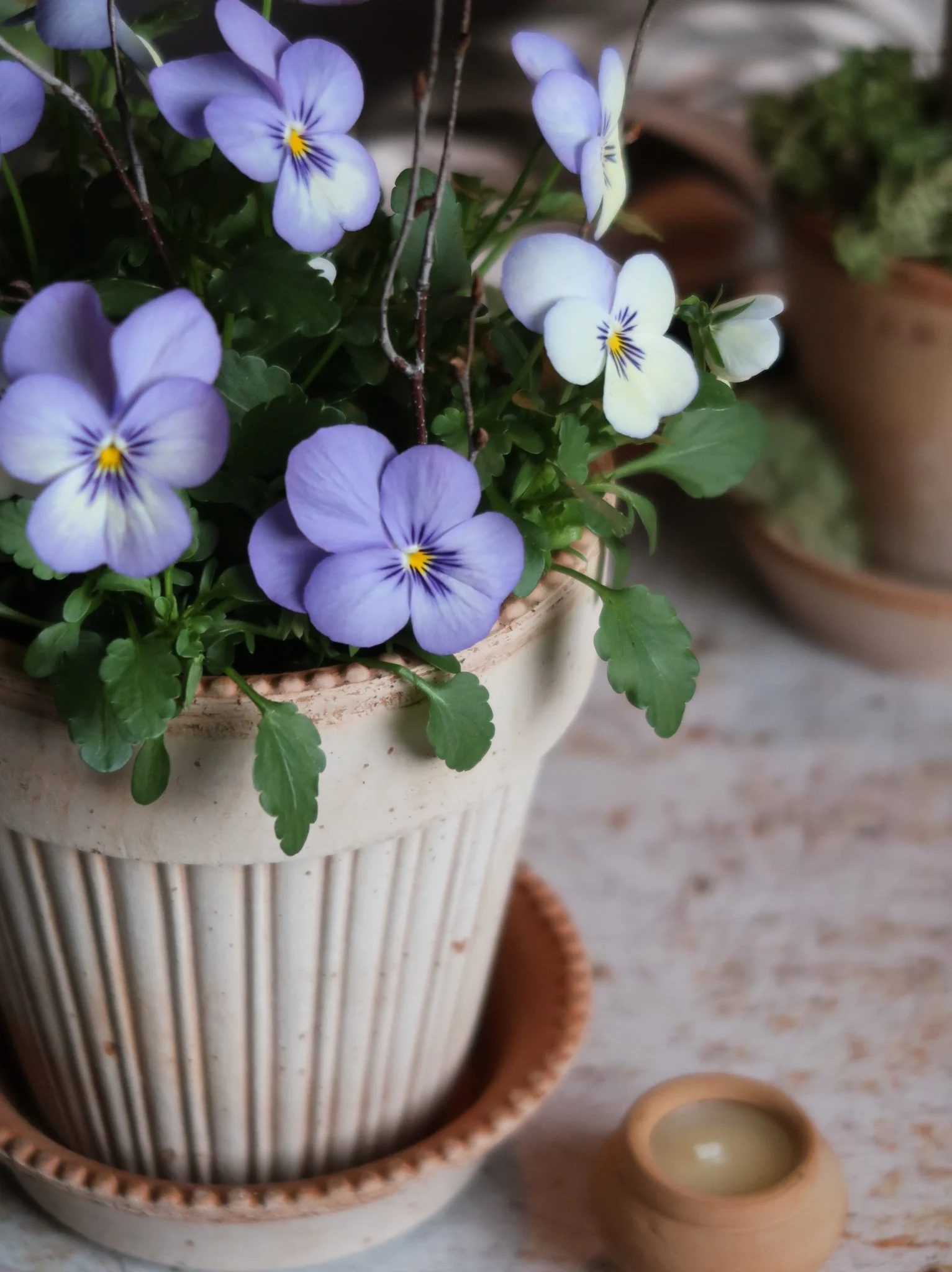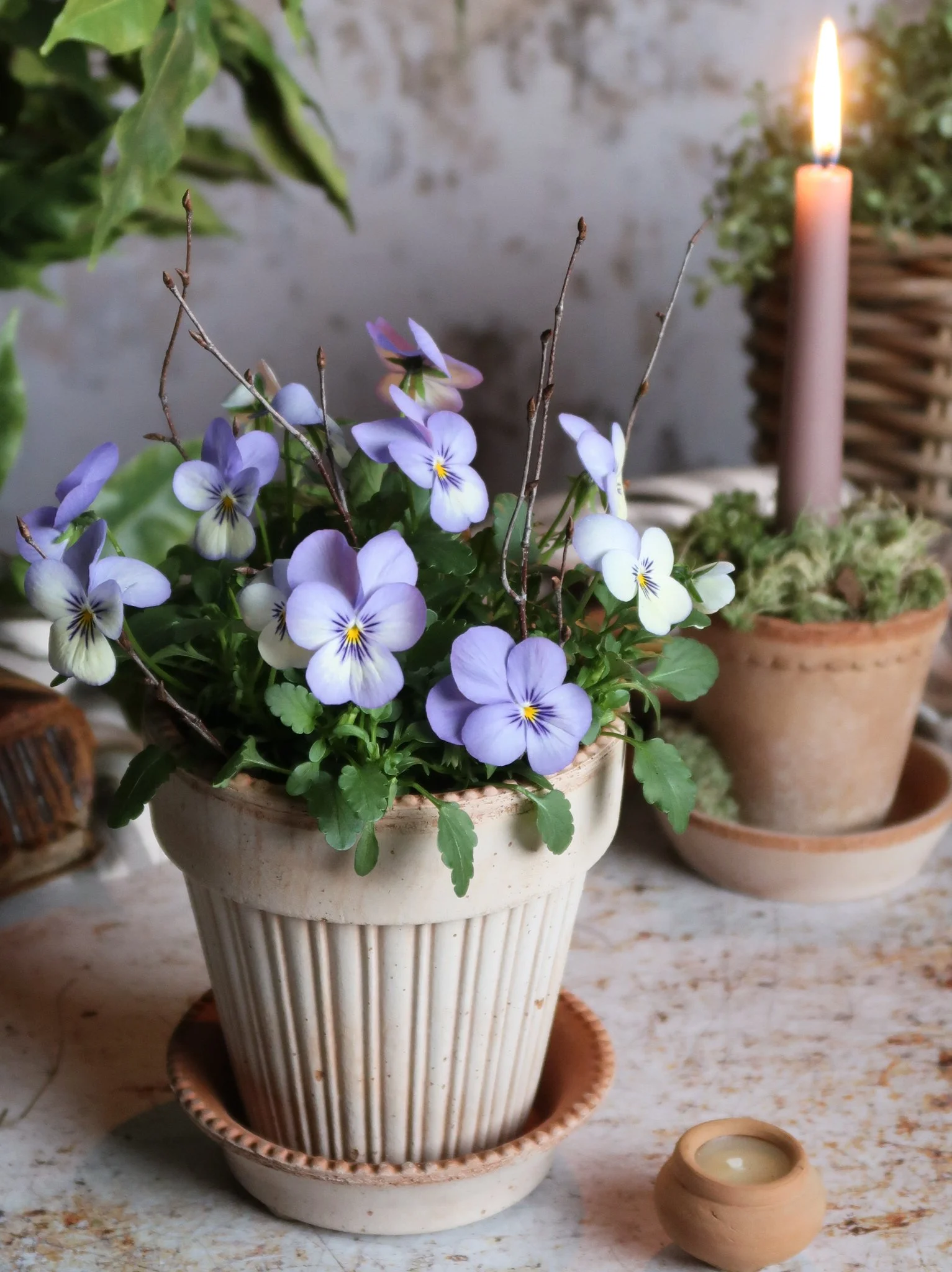 Little purple viola florals are nestled amongst textural mosses, birch twigs & dried thyme & styled in a delicately detailed rose terracotta pot & saucer. Everything you need to create this kit is included & we will show you how to pot it up (sharing our care tips & advice) in our step-by-step tutorial HERE.