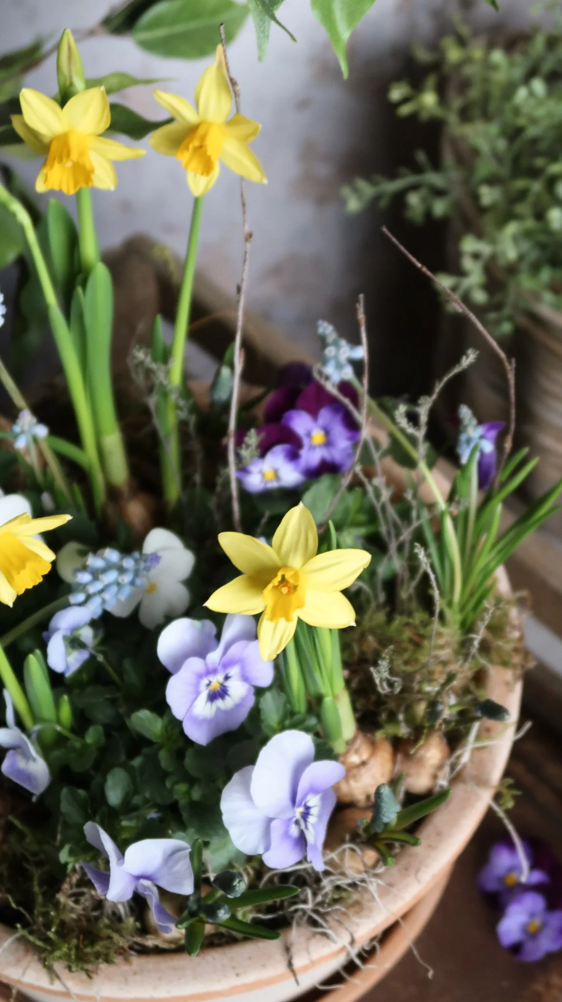 Blue Muscari, 3 viola plants, Yellow Tete a Tete.