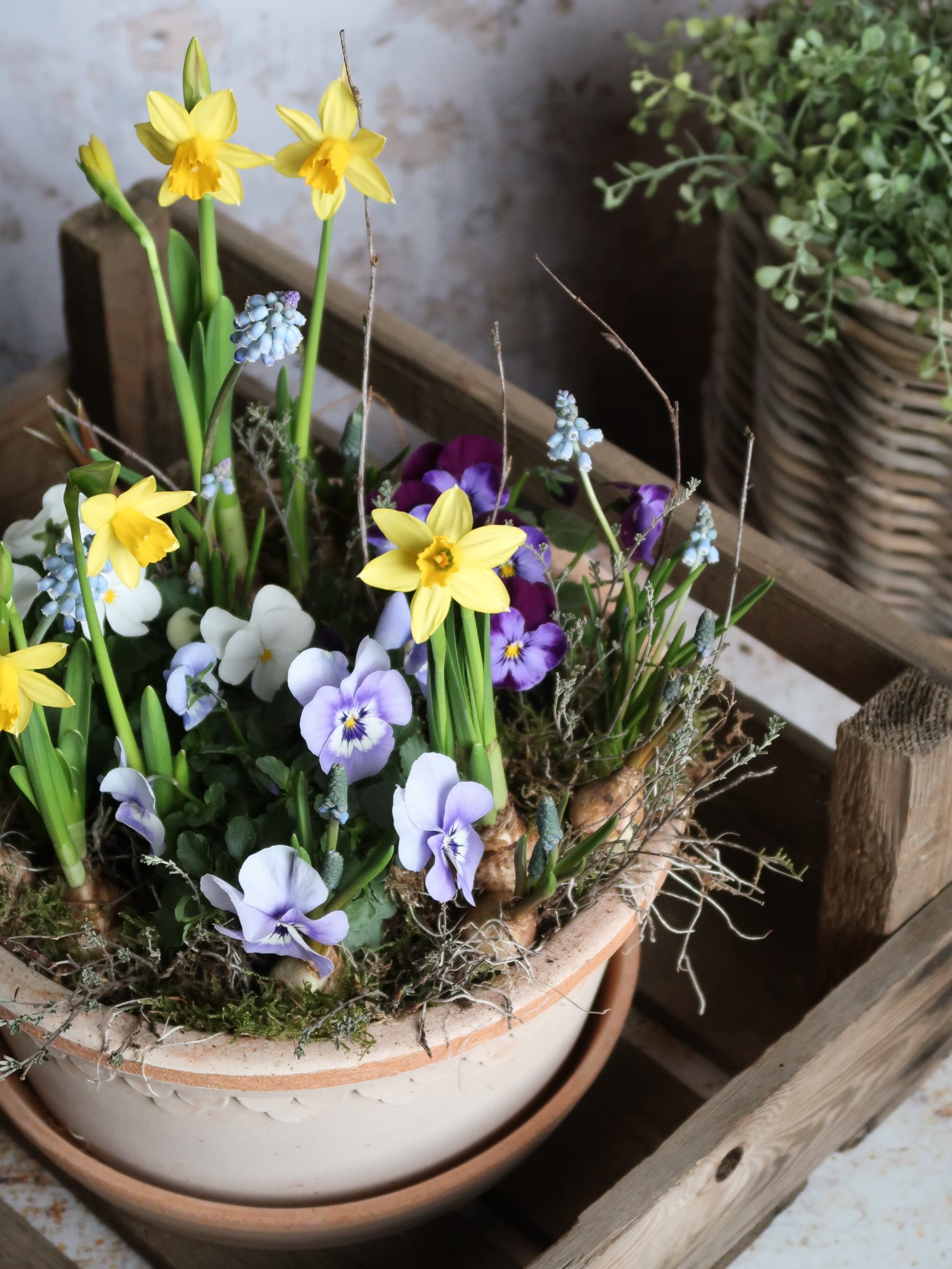 This gorgeous planter pot has exceptional scalloped detailing and is the perfect size and shape to style your home or send as a gift. Delicate blue muscari bulbs nestle amongst lilac, indigo & white violas with dainty lemony-yellow tete a tete, finished with textural mosses, dried thyme & birch twigs. Everything you need to create this kit is included & we will show you how to pot it up (sharing our care tips & advice) in our step-by-step tutorial HERE.